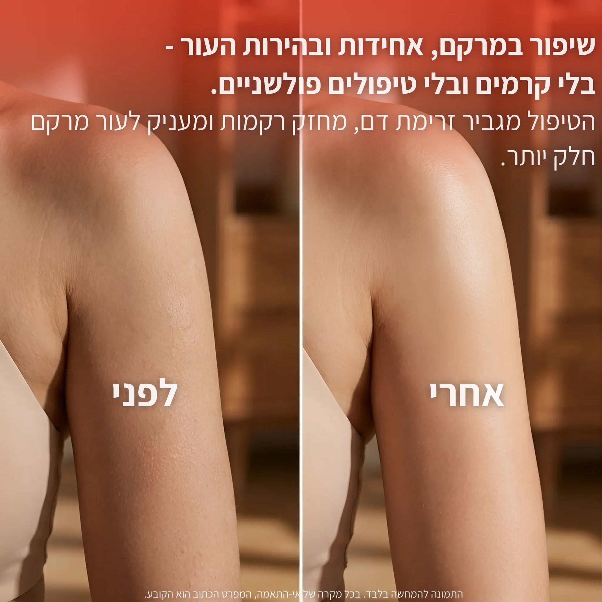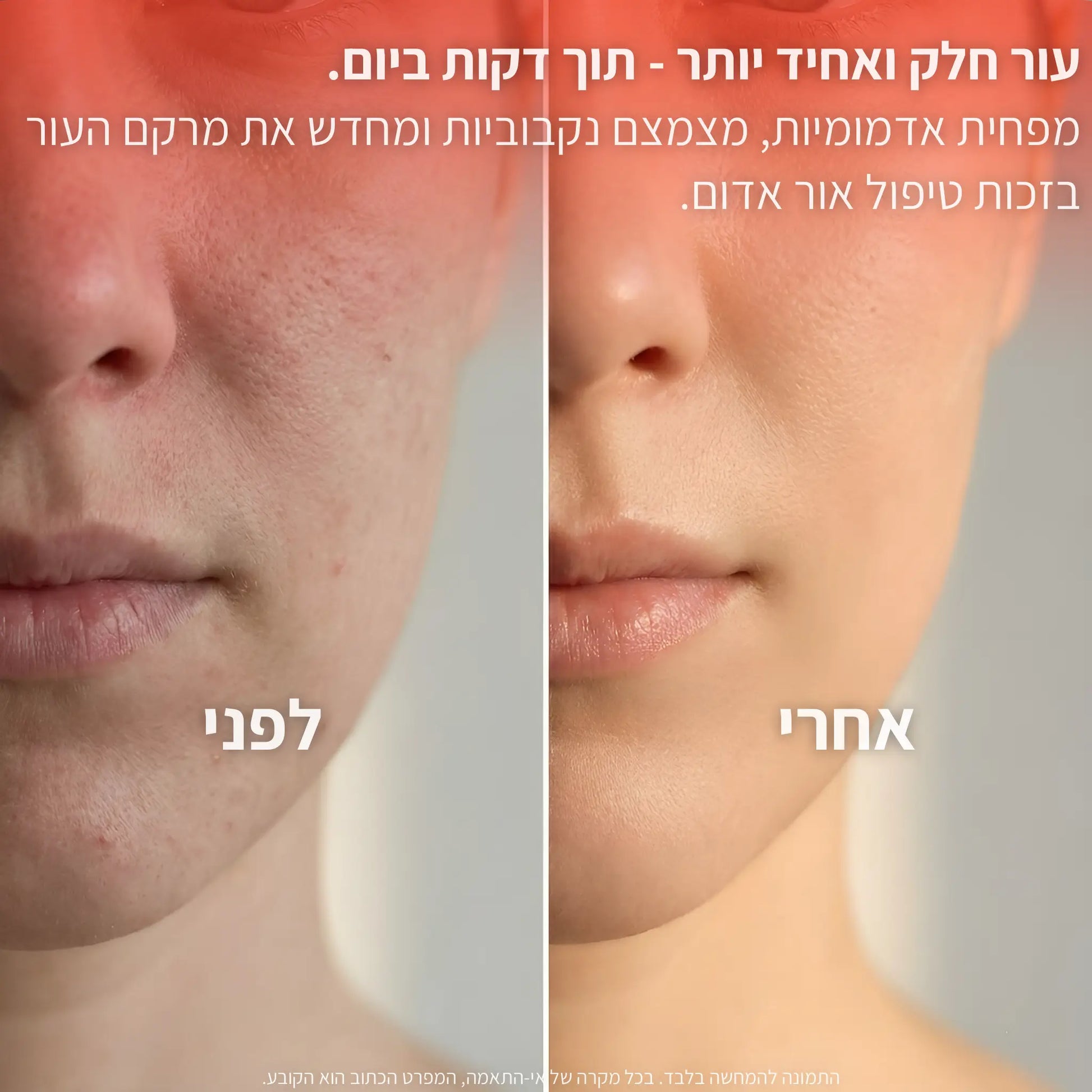 חודר לשכבות העור ומפעיל תהליכי תיקון טבעיים - אור אדום בעוצמה גבוהה נספג ברקמות העור ומפעיל מחדש את התאים שאחראים על בריאות ומראה העור.
