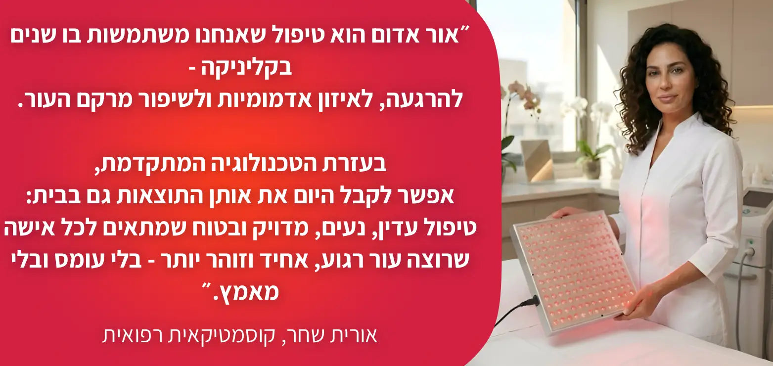 כן. הטיפול מבוסס על אור אדום בלבד - ללא כימיקלים, ללא חימום מזיק וללא מגע ישיר עם העור. מתאים לכל סוגי העור, כולל עור רגיש.